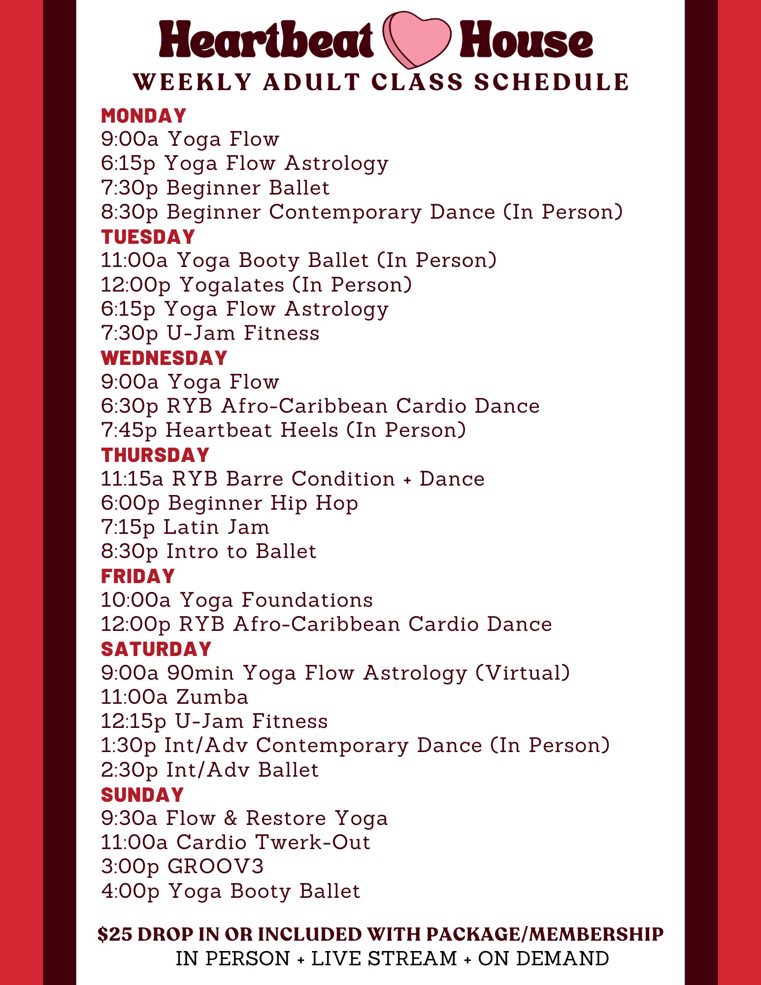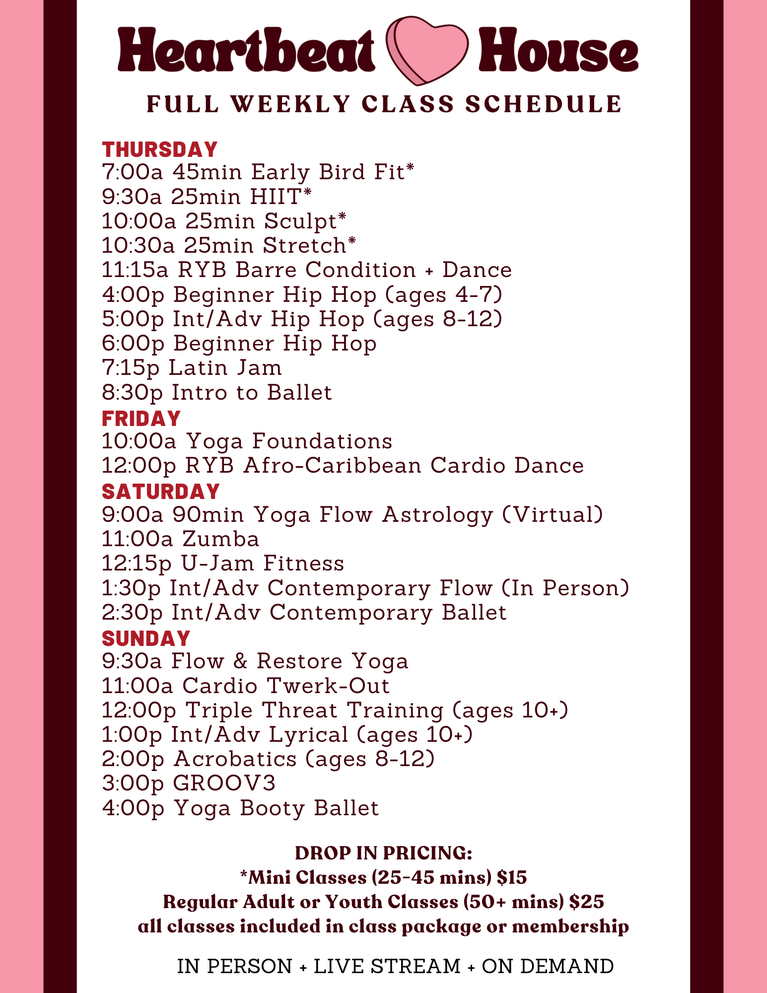 December 8, 2025 Weekly Class Schedule 2026 HeartbeatHouse Dance, Fitness, Pilates, Yoga, Youth Classes Upcoming Class Schedule Find your favorite classes on our schedule, and register here!
