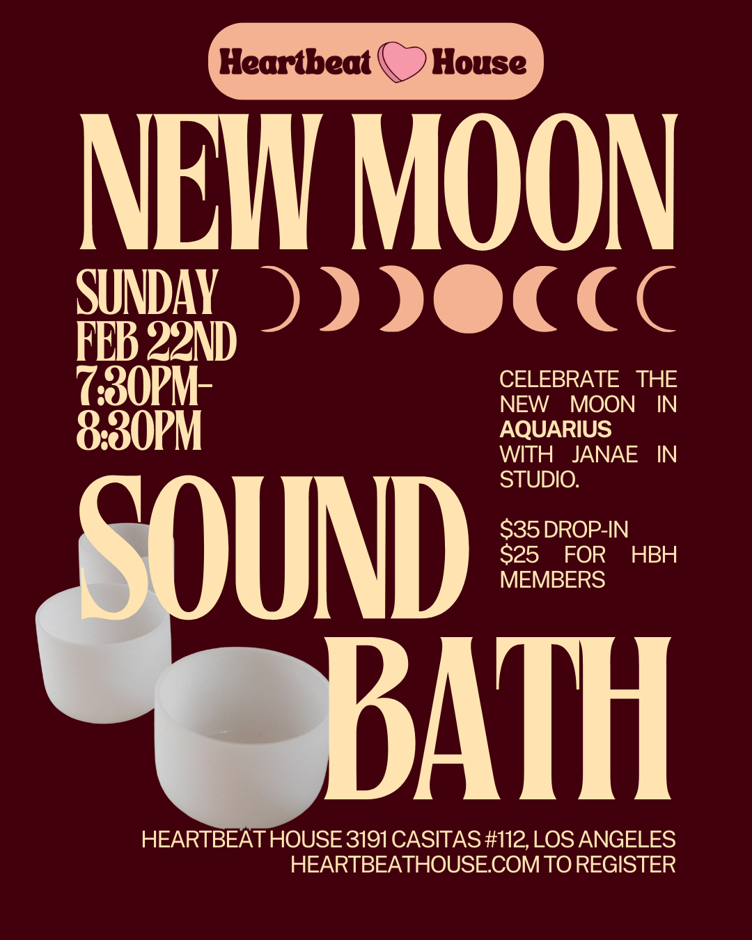 December 30, 2025 New Moon Sound Baths 2026 HeartbeatHouse Events, Sound Bath, Special Event Aquarius New Moon Sound Bath Click here to sign up for Janae's next sound bath at Heartbeat House!